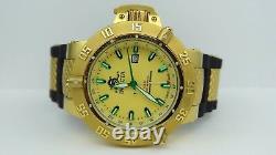 Scratch resistant flame fusion crystal. Functions: date, hour, minute, second, GMT. Invicta Subaqua GMT Gold Dial Black Polyurethane Men's watch 13921.