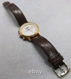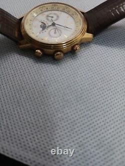 This vintage Wittnauer QWR Moonphase watch for men features a striking gold case, with a gold bidirectional rotating bezel and a white dial with Roman numerals. The watch is powered by a Swiss quartz movement and includes features such as central second, seconds hand, moon phase, 12-hour dial, and world time. The two-piece leather strap completes the classic look of this luxury watch, which is suitable for both formal and casual occasions. The watch is not water-resistant and does not come with papers or original packaging. This Wittnauer QWR Moonphase watch is a true gem for watch enthusiasts and collectors alike.